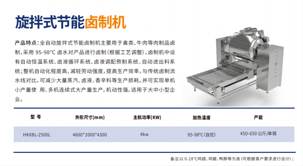 全?動旋拌式節(jié)能?制機主要?于禽類、??等?制品?制,采? 95-98 °C ??對產(chǎn)品進??制(根據(jù)?藝調(diào)整),?制機中設(shè)有?動恒溫系統(tǒng)、?液循環(huán)系統(tǒng)、?液調(diào)配熬制系統(tǒng)、?動進出料系統(tǒng);整機?動化程度?,減輕勞動強度,提??產(chǎn)效率,與傳統(tǒng)?制流?線對?,可減少?量蒸汽、?液、??料等?產(chǎn)損耗,并可實現(xiàn)單機?產(chǎn)量使 ?、多機連續(xù)式?產(chǎn)量?產(chǎn),機動性強,適?于?中?型企業(yè)。